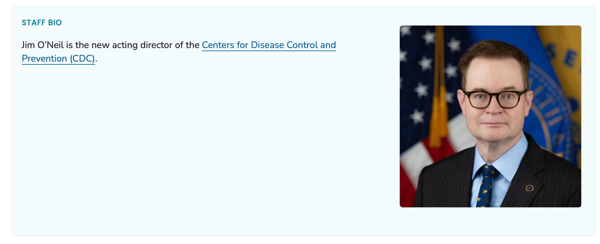 Since Kennedy fired Susan Monarez, the CDC’s Acting Director has been Jim O’Neill, a biotech executive installed to do what she would not—that is, Secretary Kennedy’s bidding on vaccine policy. (Whatever else one might think, the CDC’s own regard for O’Neill is such that it could not even be bothered to spell his name correctly on its leadership page.)